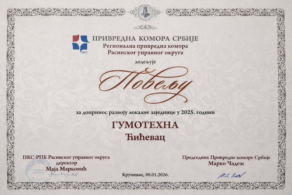 “Gumotehna” Ćićevac is the recipient of the Charter for Contribution to the Development of the Local Community, awarded by the Chamber of Commerce and Industry of Serbia – Regional Chamber of Commerce Kruševac. This recognition belongs to our family-owned company and all employees who share the same values and contribute to the community in which we live and operate.