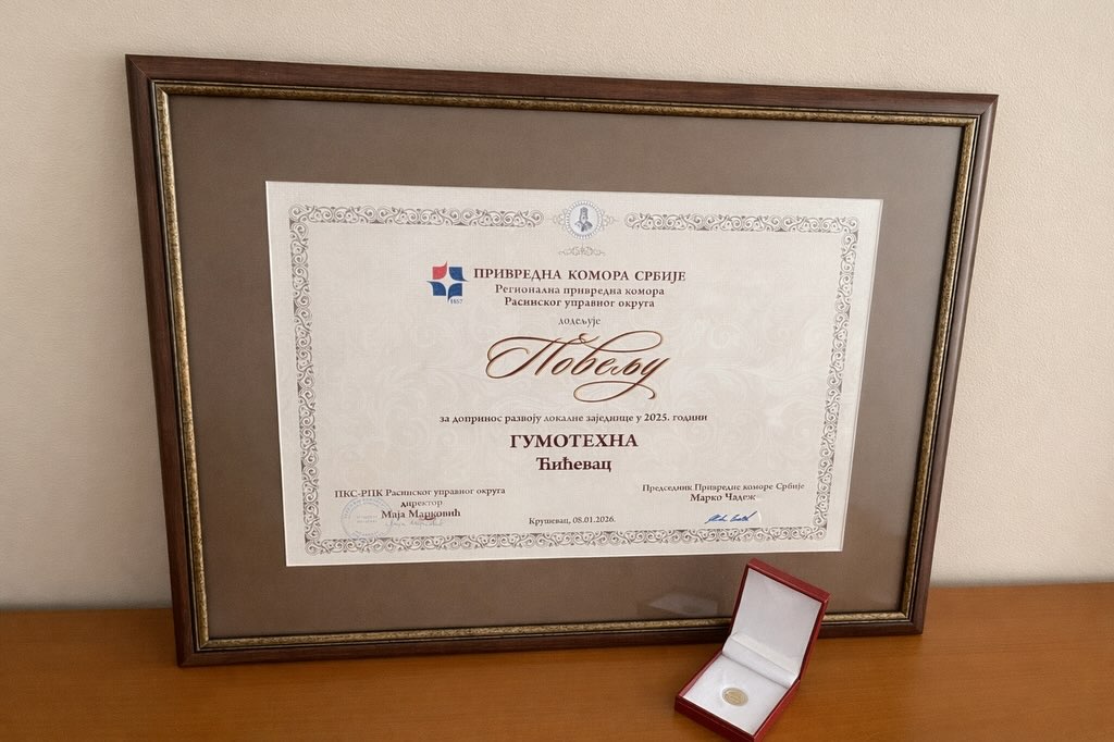 “Gumotehna” Ćićevac is the recipient of the Charter for Contribution to the Development of the Local Community, awarded by the Chamber of Commerce and Industry of Serbia – Regional Chamber of Commerce Kruševac. This recognition belongs to our family-owned company and all employees who share the same values and contribute to the community in which we live and operate.